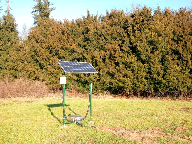 A két tekercset az észak-déli és a kelet-nyugati irányokban tájolva helyeztük el néhány 10 cm-re a földfelszín alá, hogy óvjuk őket a rázkódástól amennyire lehetséges. A mérőrendszer nem is látható, csak az elektronikát tápláló napelem és az akkumulátorokat tartalmazó mérőláda van a föld felszíne felett.