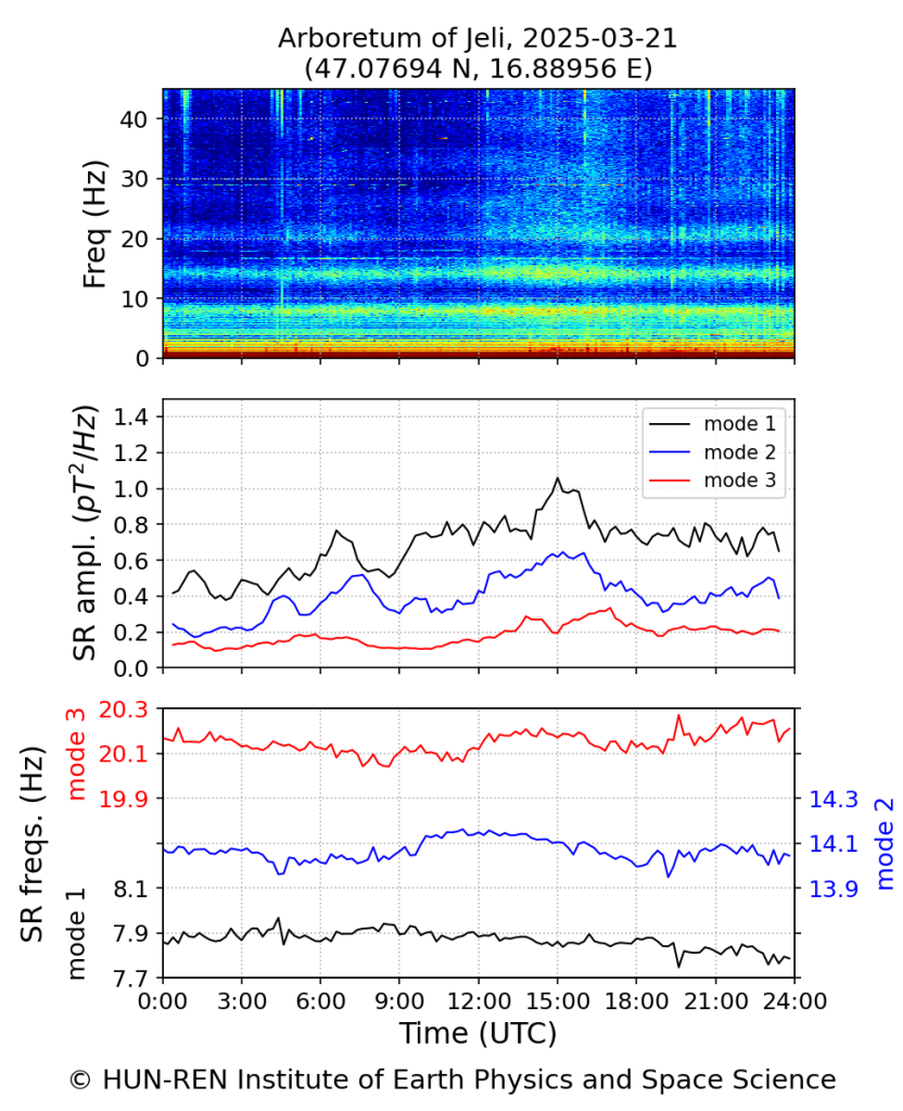 A középső és az alsó ábrán az első három Schumann-rezonancia (rezonancia módus) csúcsfrekvenciájának (alsó panel) és a hozzátartozó jelintenzitásoknak a napi változása látható.