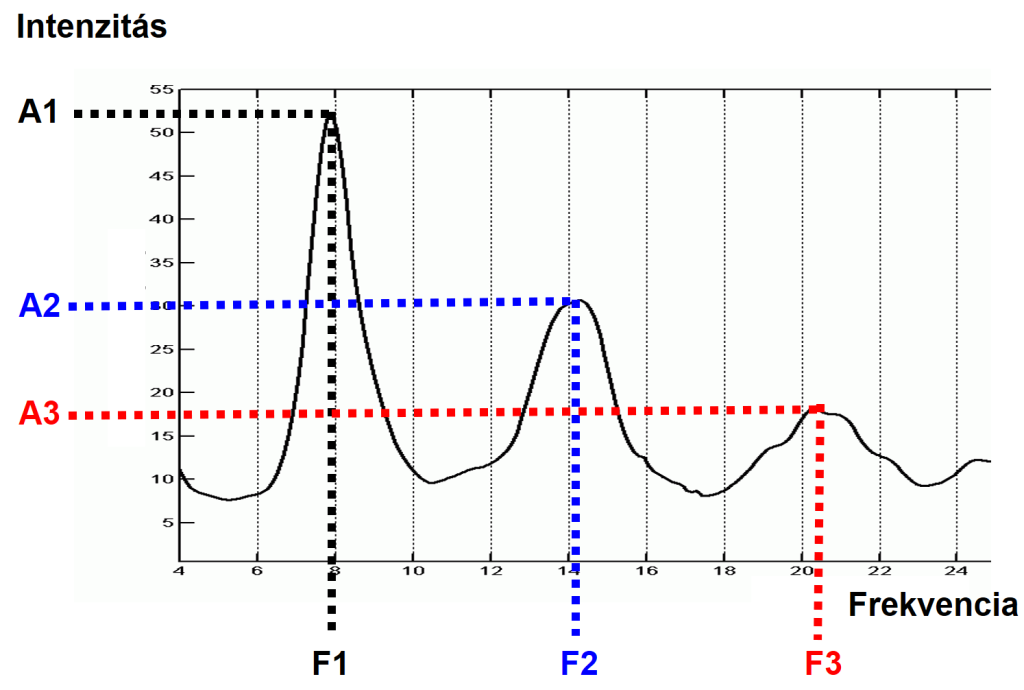 Egy adott időpontban a spektrum első három rezonanciacsúcsát és a hozzátartozó paraméterek jelentését az alábbi ábra mutatja.