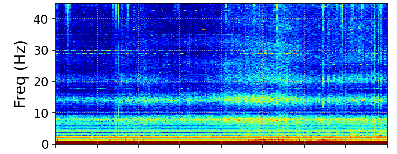 A 0 Hz (statikus komponens) felé közeledve (egyre hosszabb periódusú hullámkomponensek) az ábra aljánál a jel intenzitása növekszik. Ez részben a mérési elektronika saját zaja (ún. 1/f típusú zaj), másrészt mesterséges eredetű külső zajok is okozzák, harmadrészt itt az inkább már geomágneses, nem villámoktól eredő természetes jel erőssége is növekszik.